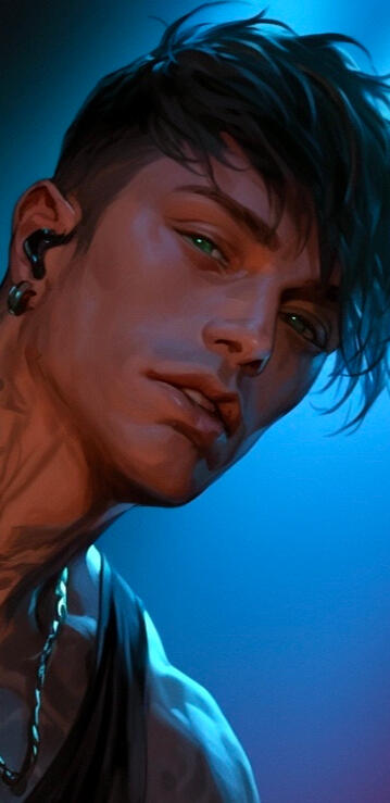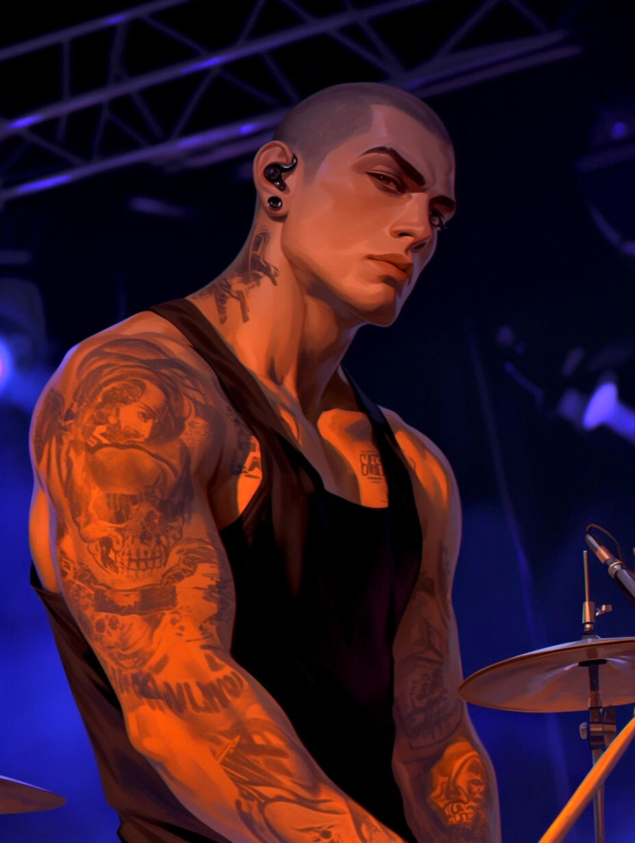Solomon Peck, the relentless and rhythmic heartbeat of False Prophets, is the foundation upon which the band’s chaotic sound rests. Born Samuel Peck, Solomon shed his birth name along with the shame of a deeply conservative upbringing, choosing a moniker that reflects both his strength and his silent wisdom. Despite being the quietest member of the band, Solomon’s presence is impossible to ignore when he’s behind the drum kit, his precise, thunderous playing driving the band’s sound to the edge of madness.Offstage, Solomon is a man of few words, preferring to let his music speak for him. He’s the steady hand that keeps the band grounded, a silent guardian with a wry sense of humor that only those closest to him ever get to see. Though he rarely opens up about his past, his bandmates know that every beat he pounds out is a small act of defiance against the life he left behind.Fun Fact: Solomon has a ritual of tapping out drum patterns on every available surface when he’s nervous, often driving his bandmates to the brink of madness during long drives between shows.